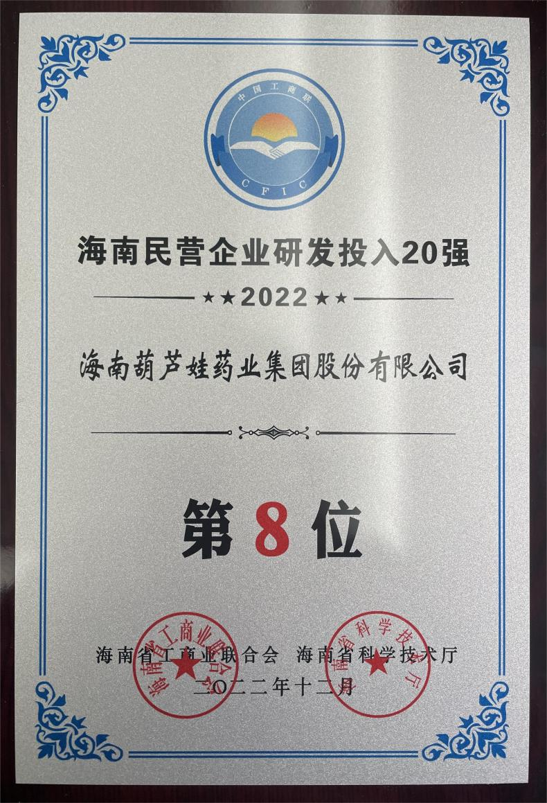 12月23日,2022海南民营企业50强和研发投入20强发布会在海口举行。会上发布了“2022海南民营企业50强”“2022海南民营企业研发投入20强”榜单和分析报告。GA黄金甲药业再次荣登两榜,在海南民营企业50强榜单中位列第25位,较去年上升8位,这也是公司连续三年登榜;在海南民营企业研发投入20强中位列第8位,较去年上升7位。
